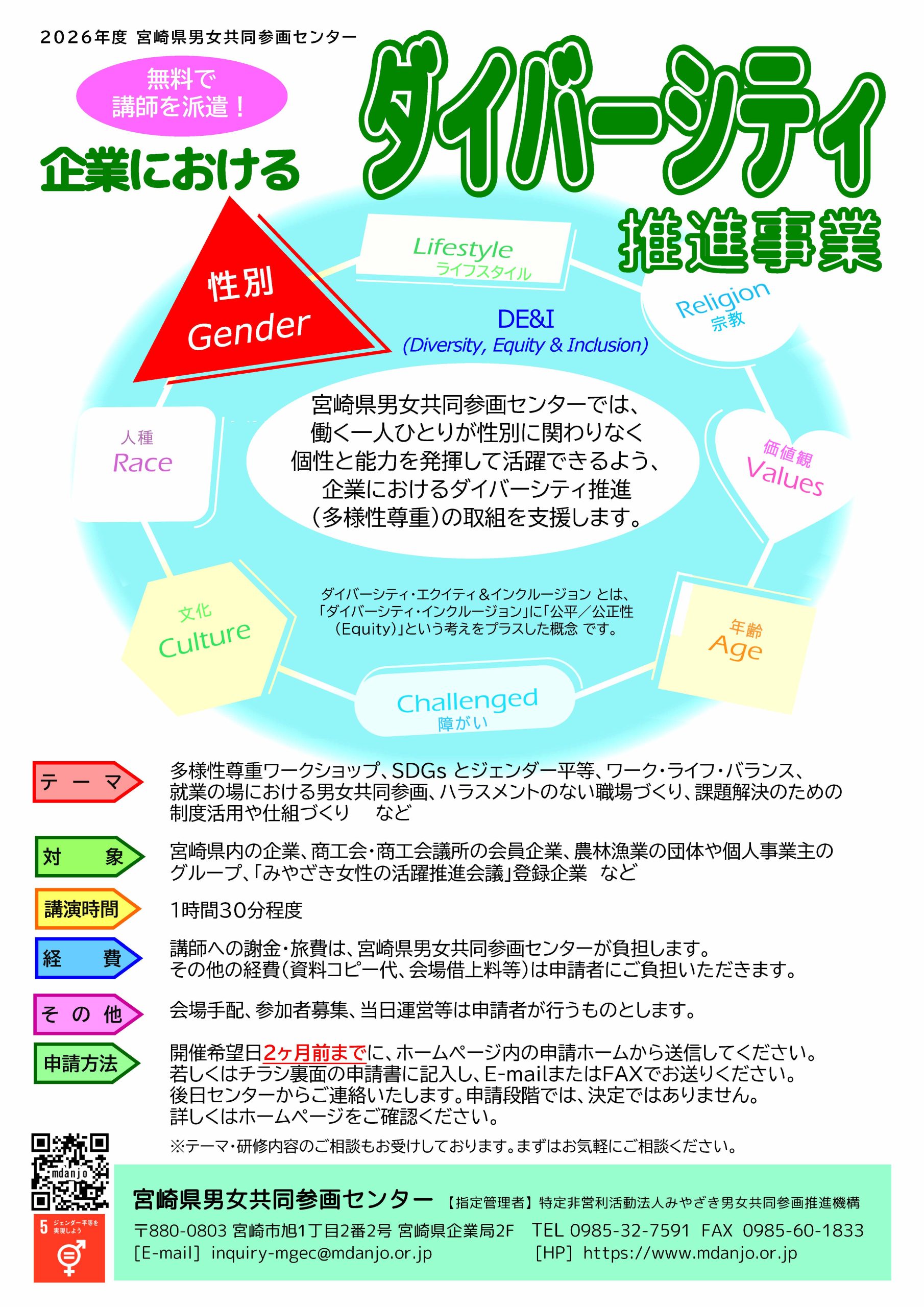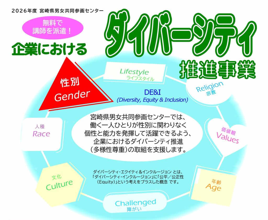 宮崎県男女共同参画センターでは、女性だけでなく、働く一人ひとりが個性と能力を発揮して活躍できるよう、企業におけるダイバーシティ推進(多様性尊重)の取組を支援しています。