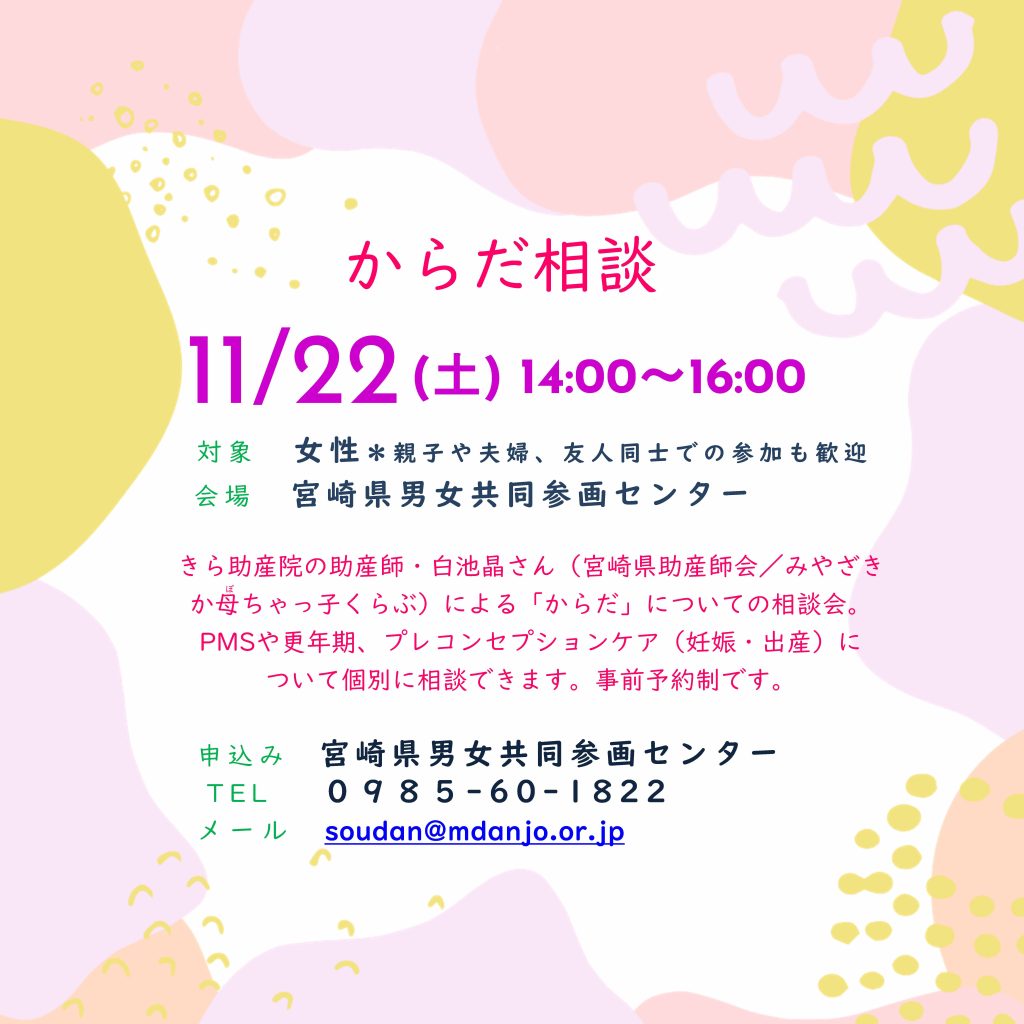 きら助産院の助産師・白池晶さん(宮崎県助産師会/みやざきか母ちゃっ子くらぶ)による「からだ」についての相談会。PMSや更年期、プレコンセプションケア(妊娠・出産)について個別に相談できます。事前予約制です。