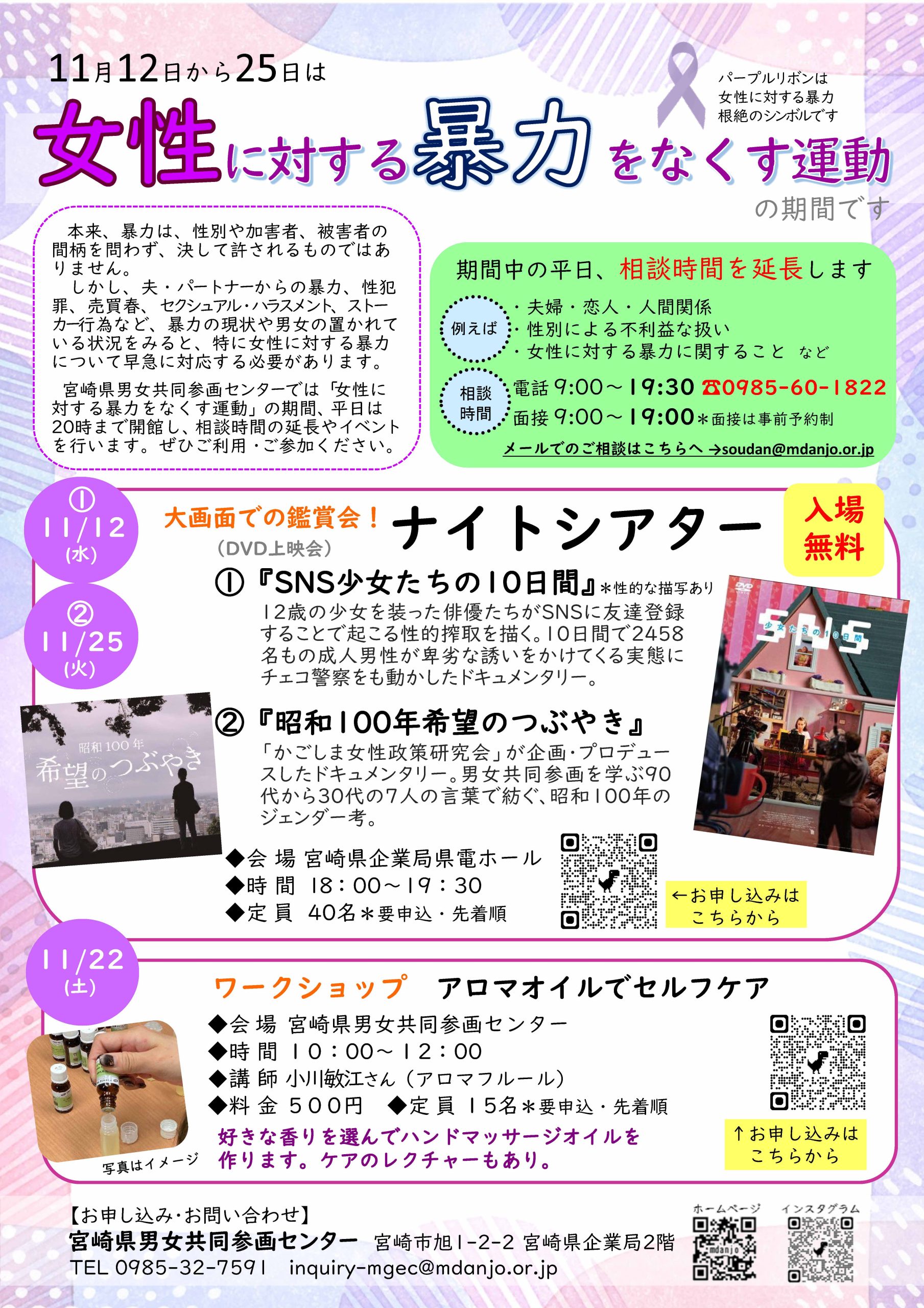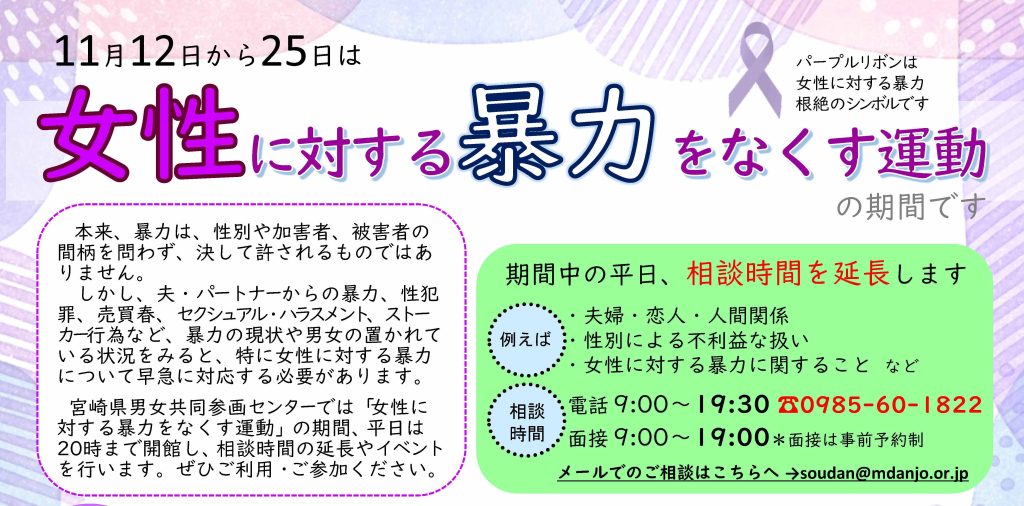宮崎県男女共同参画センターでは、女性に対する暴力をなくす運動の期間中(11月12日~25日)、平日の開館時間を20時まで延長した夜間開館を行います。期間中、ナイトシアター(DVD上映会)やワークショップ、男性版 しゃべり場 もやっとさんなどを開催します。また、期間中の平日は相談時間も19時30分まで延長します。