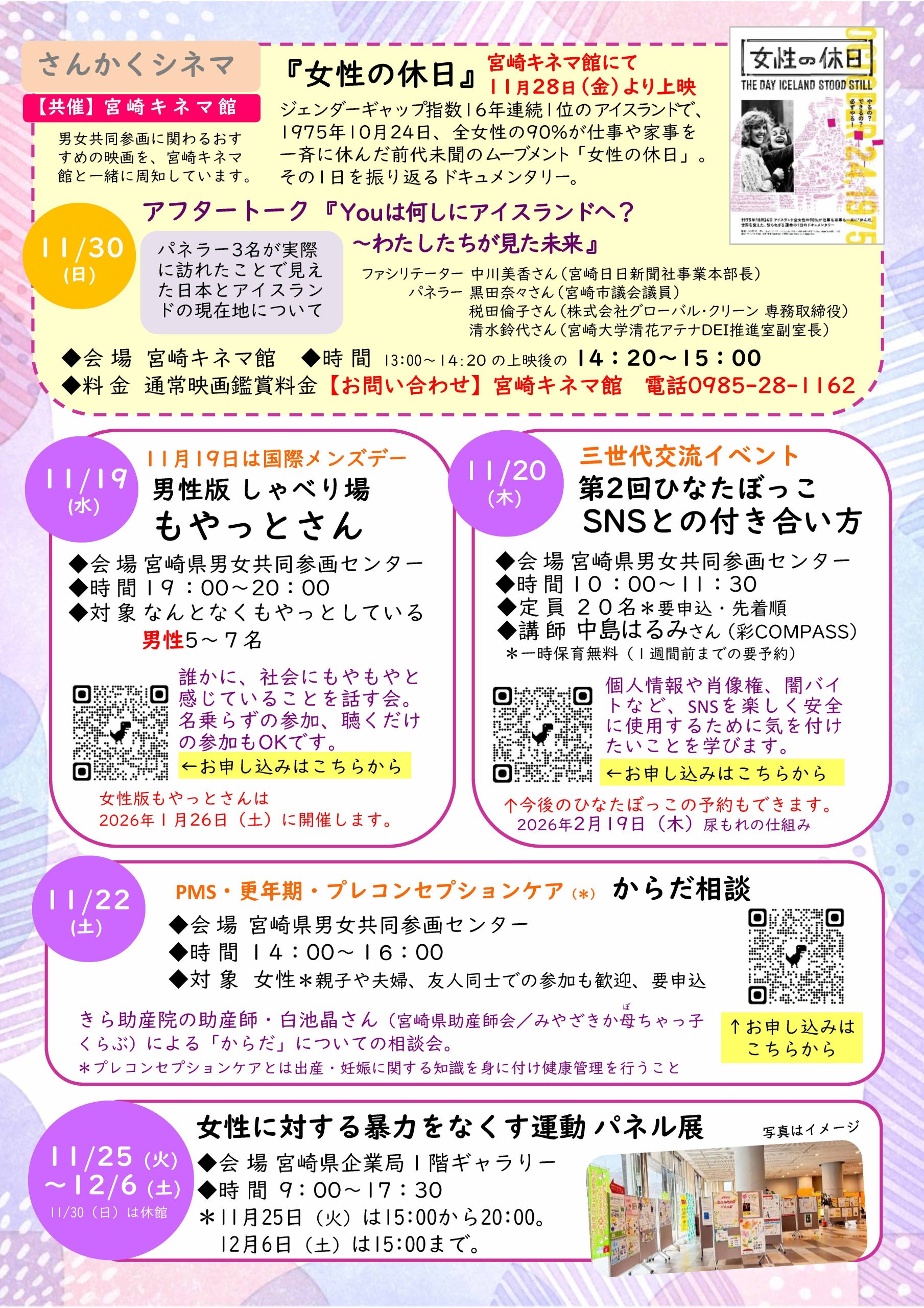 【さんかくシネマ 映画『女性の休日』上映&アフタートーク『Youは何しにアイスランドへ?わたしたちが見た未来』】 さんかくシネマ”として男女共同参画に関わるおすすめの映画を宮崎キネマ館と一緒に周知しています。今回は11月28日(金)より上映になる『女性の休日』をピックアップ。11月30日(日)は上映後、昨年アイスランドを訪問した3名によるアフタートークを開催します。 ■11月30日(日)上映13:00~14:20 アフタートーク14:20~15:00 会場/宮崎キネマ館 料金/通常映画鑑賞料金 <ファシリテーター> 中川美香さん(宮崎日日新聞社事業本部長) <パネラー>黒田奈々さん(宮崎市議会議員)/税田倫子さん(株式会社グローバル・クリーン 専務取締役)/清水鈴代さん(宮崎大学清花アテナDEI推進室副室長) お問い合わせ/宮崎キネマ館 ℡0985-28-1162