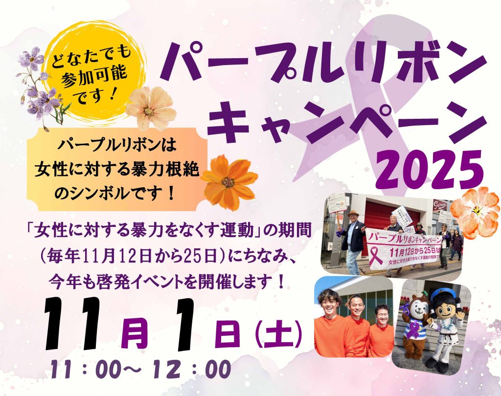DV(ドメスティックバイオレンス)など、個人間の暴力や虐待の防止と啓発を目的としています。パープルリボンは女性に対する暴力根絶のシンボルです。誰も加害者にも被害者にも傍観者にもならないために、暴力のない社会を目指して今年もキャンペーンを実施します。